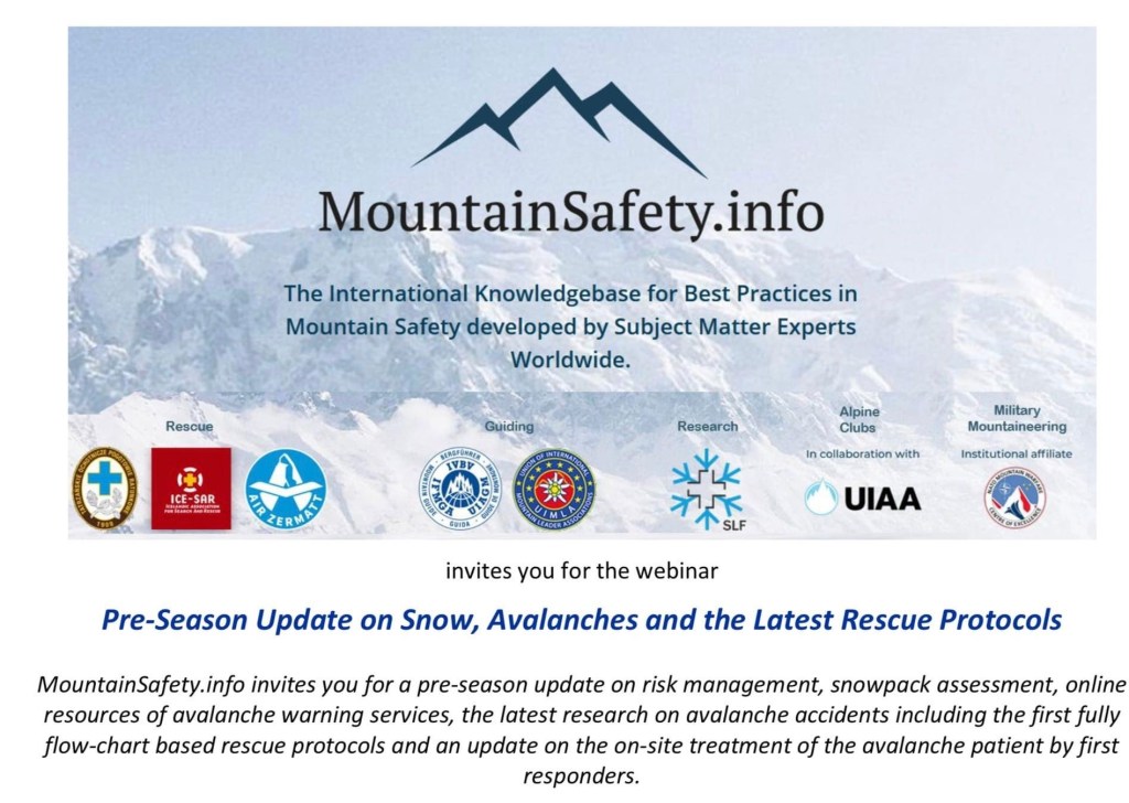 El lunes 20 de diciembre de 2021, la UIMLA se unió a nuestros colegas de otras organizaciones como MountainSafety.info para una actualización previa a la temporada sobre gestión de riesgos, evaluación de la capa de nieve, recursos en línea de los servicios de alerta de avalanchas, las últimas investigaciones sobre accidentes de avalanchas, incluido el primer diagrama de flujo completamente basado protocolos de rescate y una actualización sobre el tratamiento in situ del paciente de avalancha por …